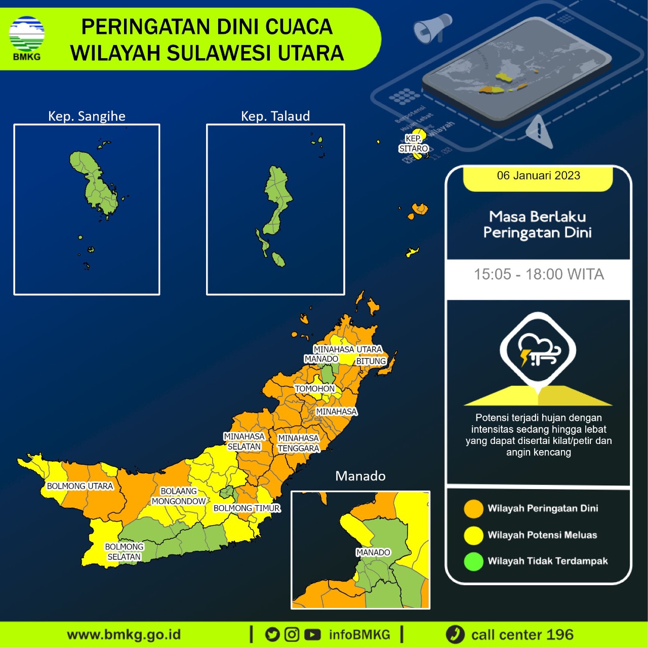 Menurut, analisis yang dikeluarkan oleh Badan Meteorologi Klimatologi dan Geofisika Stasiun Meteorologi Sam Ratulangi Manado, siang tadi ada 9 kabupaten dan kota di Sulut yaitu Sangihe, Sitaro, Talaud, Minahasa Selatan, Bolmong, Bolsel, Manado, Bitung dan Minut yang masuk sebagai daerah rawan bencana hidrometeorologi yaitu hujan es, genangan, banjir, banjir badang, angin kecang, puting beliung maupun tanah longsor.