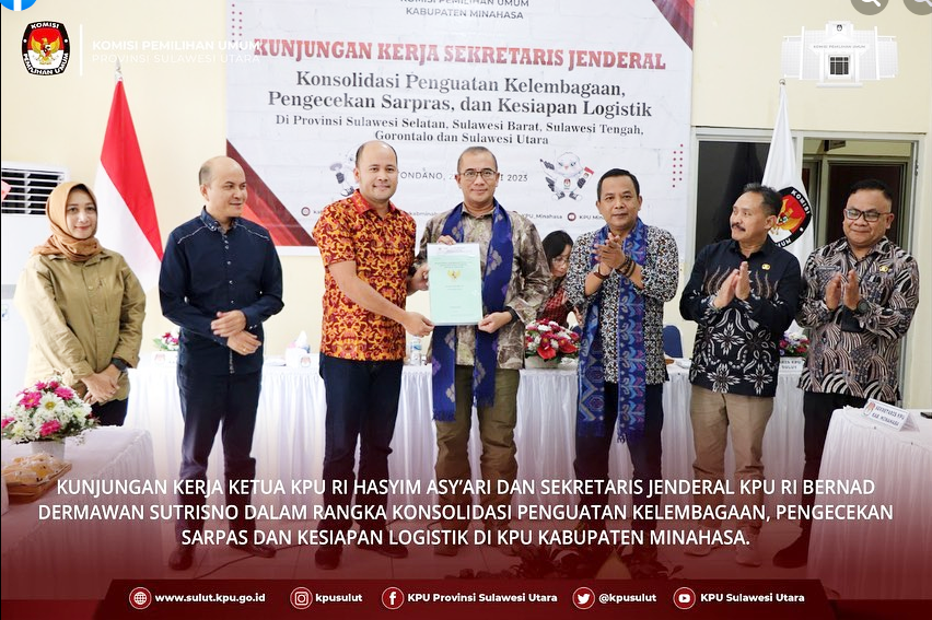 MANADO, 24 JANUARI 2023 – Dalam rangka konsolidasi, penguatan kelembagaan, pengecekan sarana dan prasarana serta kesiapan logistik untuk pelaksanaan tahapan Pemilihan umum (Pemilu), dan Pemilihan Kepala Daerah (Pilkada) serentak Tahun 2024, Ketua KPU RI Hasyim Asy’ari melakukan kunjungan kerja di Nyiur melambai.