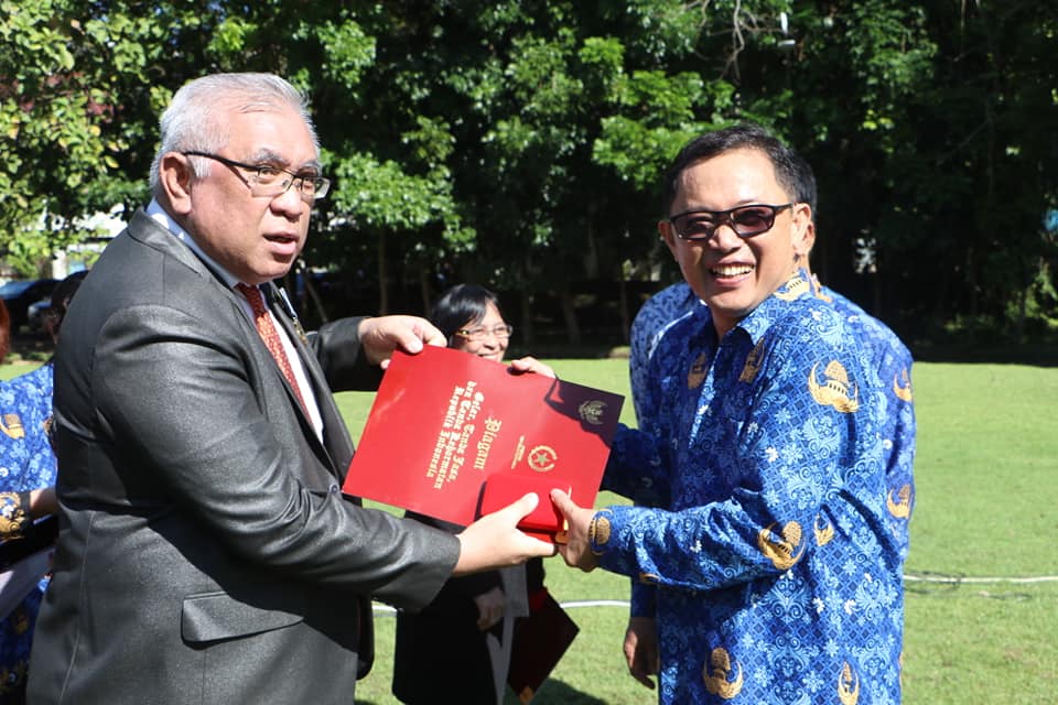 MANADO, 2 MEI 2023 – Wajah Dr Ir Renee Charles Kepel DEA, penuh senyum saat namanya dibacakan sebagai salah satu dari 28 dosen dan tenaga pendidik di Universitas Sam Ratulangi (Unsrat), yang berhak menerima penghargaan dari pemerintah Indonesia, Satya Lencana.