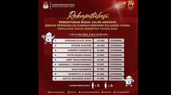 Kesembilan warga ini adalah, Stefanus BAN Liow, Djafar Alkatiri, Cherish Harriette, Putri Rejeki Kasad, Abid Takalamingan, Adriana Dondokambey, Maya Rumantir, Murphy EK Kuhu dan Aditya Anugrah Moha. “Berkas mereka yang masuk pertama apda 2 Mei lalu adalah Stefanus BAN Liow kemudian yang terakhir adalah Aditya Anugrah Moha pada 14 Mei, berkas diterima,” kata Ketua KPU Sulut, Meidy Tinangon, sembari menambahkan total bacalon DPD RI dari Sulut terdiri lima pria dan empat perempuan. (gracey wakary)