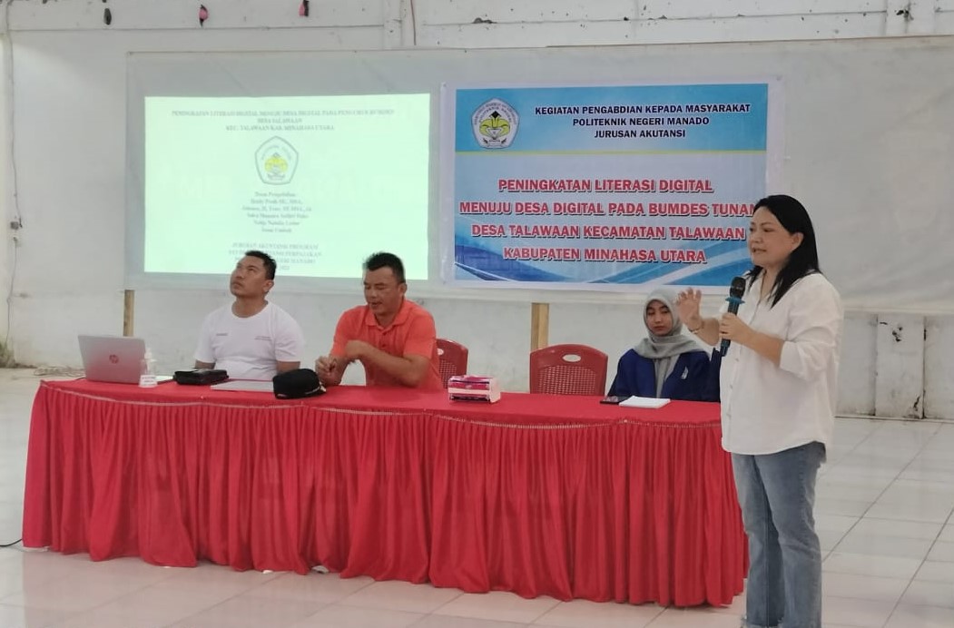 Kegiatan yang menjadi bagian utama dari Tridharma PT, digelar oleh Jurusan Akuntasi di Desa Talawaan Kecamatan Talawaan Minahasa Utara (Minut). Dimana kehadiran Polimdo adalah bertujuan untuk meningkatkan literasi digital menuju desa digital, pada pengurus BUMDES Desa Talawaan. Penanggungjawab sekaligus pemateri pada kegiatan ini Heidy Pesik SE MSA menjelaskan pengurus BUMDES Desa Talawaan dilatih menggunakan google docs dan spread sheet untuk membantu kelancaran data base. “Dengan adanya pelatihan ini, Kami berharap proses pengarsipan data maupun pembuatan data untuk lebih mudah dan bisa diakses oleh pengurus BUMDES Talawaan,” tutur Pesik didampingi mahasiswa Jurusan Akuntansi Polimdo Salva Munsira Saf Tri Dako, Neltje Natalia Lodar, dan Josua Umboh yang juga menjadi pemateri dan pendamping pada pengabdian kepada masyarakat.