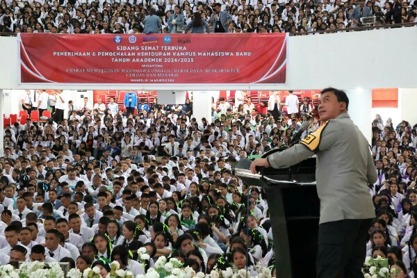 MANADO, 15 AGUSTUS 2024 – Kapolda Sulawesi Utara Irjen Pol Yudhiawan mengajak semua mahasiswa baru (maba), di Universitas Sam Ratulangi (Unsrat) yang mengikuti Pengenalan Kehidupan Kampus Mahasiswa Baru (PKKMB) Unsrat Tahun 2024, untuk taat hukum dan peka dengan keadaan sekitar.