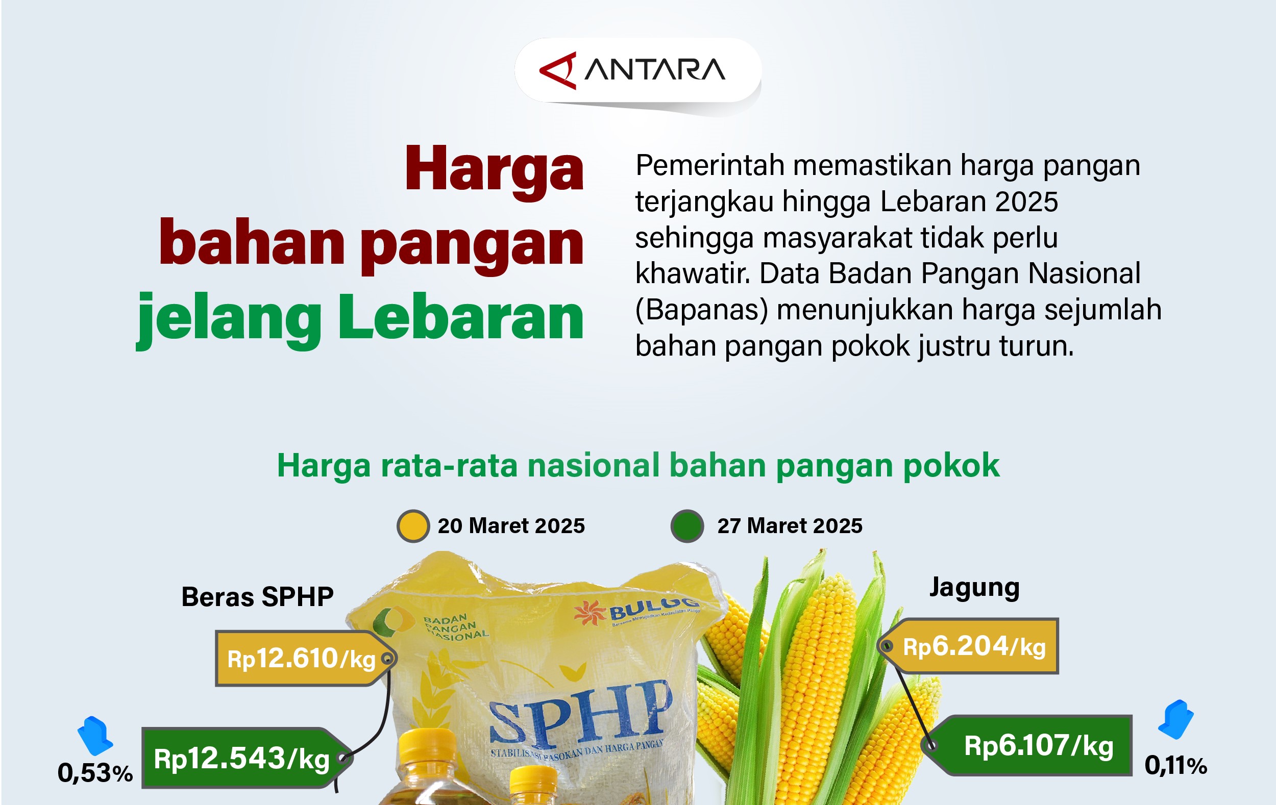 JAKARTA, 29 MARET 2025 (ANTARA) – Pemerintah memastikan harga pangan terjangkau hingga Lebaran 2025 sehingga masyarakat tidak perlu khawatir. Data Badan Pangan Nasional (Bapanas) menunjukkan harga sejumlah bahan pangan pokok justru turun. (*)