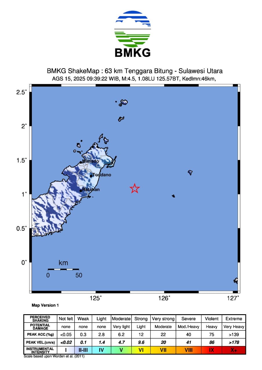 MANADO, 15 AGUSTUS 2025 – Gempa bumi tektonik, kembali mengguncang Kota Bitung pagi tadi.