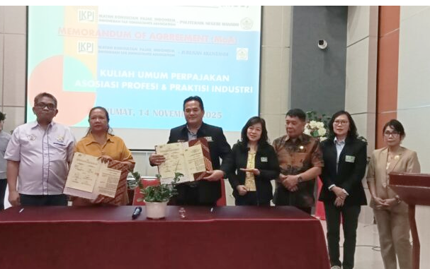 MANADO, 14 NOVEMBER 2025 – Politeknik Negeri Manado (Polimdo), mempertegas komitmennya dalam menyelaraskan dunia pendidikan dengan kebutuhan industri. Hal ini ditandai dengan penandatanganan Nota Kesepahaman (MoU) dan Perjanjian Kerja Sama (MoA) bersama Ikatan Konsultan Pajak Indonesia (IKPI) di Gedung Kuliah Terpadu (GKT) Polimdo, siang tadi.