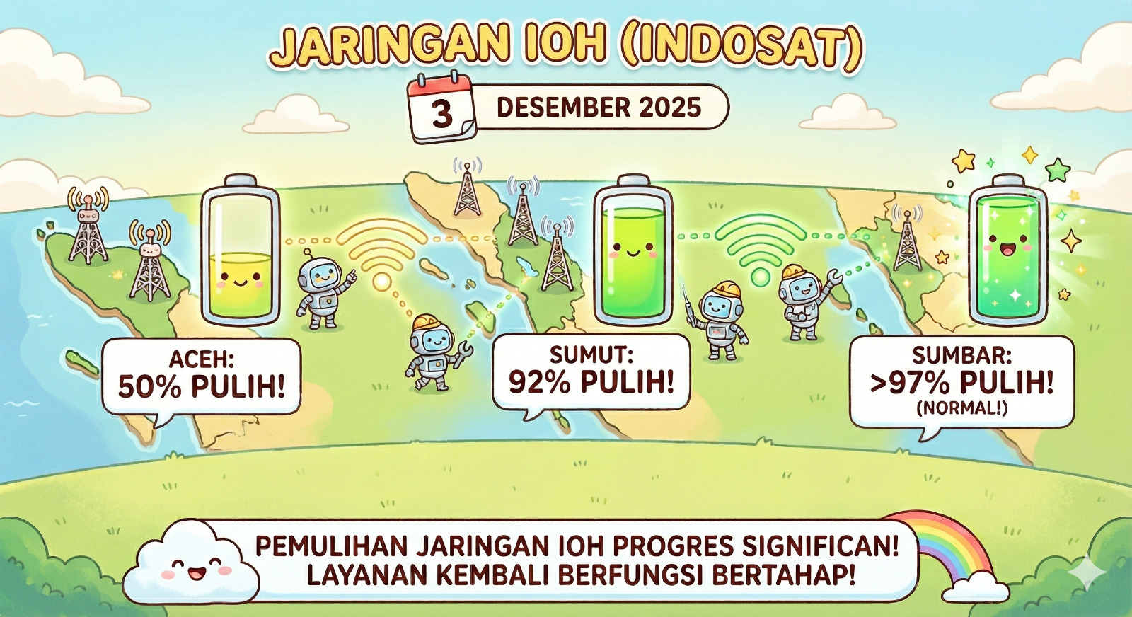Berkat sinergi tersebut, pemulihan jaringan IOH menunjukkan progres signifikan. Hingga 3 Desember 2025, layanan di sebagian besar wilayah terdampak telah kembali berfungsi secara bertahap, termasuk 50% wilayah Aceh, 92% wilayah Sumatera Utara, dan lebih dari 97% wilayah Sumatera Barat beroperasi dengan normal. (gracey wakary)
