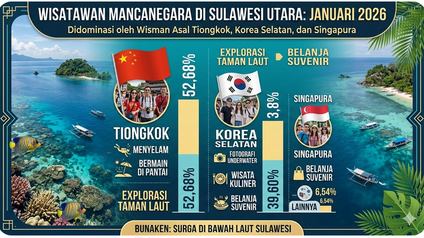 Data kunjungan ini, disebut oleh Kepala BPS Sulut Agus Sudibyo naik sebesar 7,55 persen dibandingkan dengan Desember 2025, atau data dari ke bulan (m-to-m), dan meningkat 34,61 persen dibandingkan dengan bulan yang sama pada tahun 2025 atau (y-on-y). “Wisman yang berkunjung ke Sulawesi Utara pada Januari 2026 didominasi oleh wisman yang berasal dari Tiongkok sebanyak 52,68 persen, kemudian dari Korea Selatan (39,60 persen), dan Singapura (1,18 persen). (gracey)