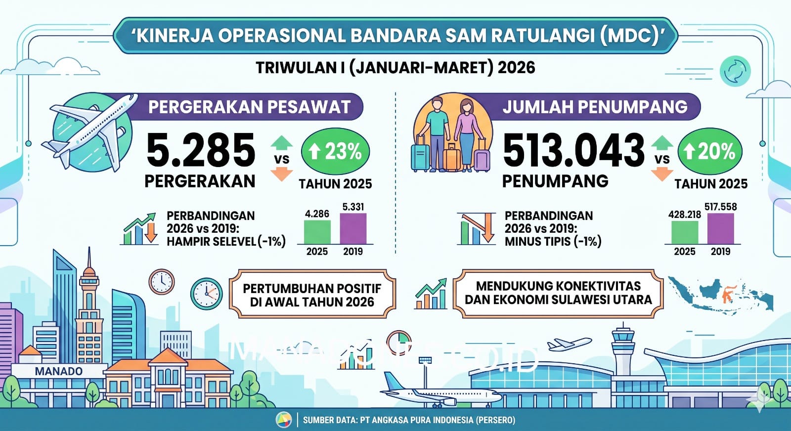 Sementara itu, jumlah penumpang hingga Maret 2026 mencapai 513.043 penumpang, atau tumbuh 20% dibandingkan tahun 2025 yaitu 428.218 penumpang, dan masih berada pada kisaran minus 1% dibandingkan tahun 2019 yaitu sebesar 517.558 penumpang. “Kami berkomitmen terus meningkatkan kualitas layanan dan memastikan operasional bandara berjalan aman, nyaman, dan efisien bagi seluruh pengguna jasa,” ujar General Manager (GM) API Bandara Sam Ratulangi Radityo Ari Purwoko. (gracey)