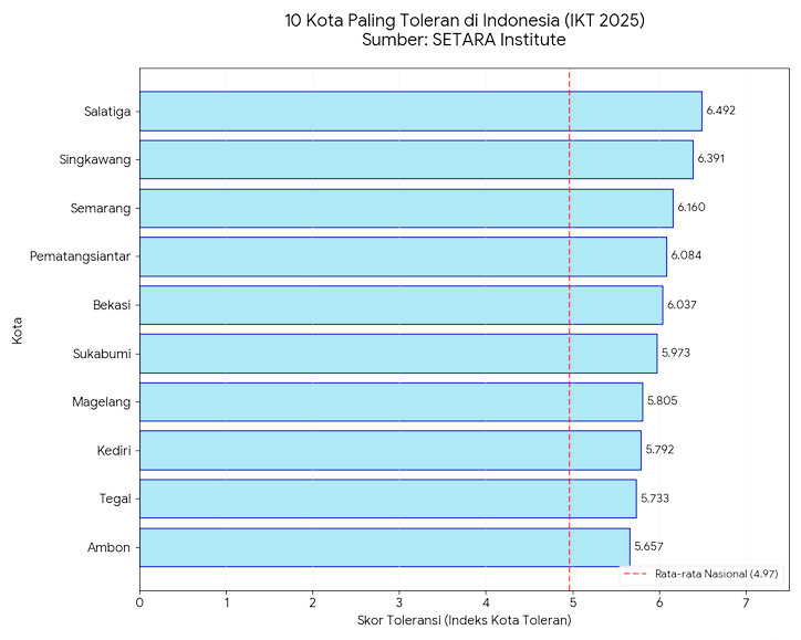 Ini terungkap dalam media sosial Setara, dimana lembaga penelitian dan advokasi yang berfokus pada isu-isu demokrasi, hak asasi manusia, pluralisme, dan kebebasan beragama/berkeyakinan ini memberikan Kota Salatiga sebagai kota dengan indeks toleran tertinggi yaitu 6,492 dan Singkawang menjadi kota nomor dua paling toleran dengan indeks 6,391 disusul Semarang (lihat grafis yang dibuat MANADONES)
