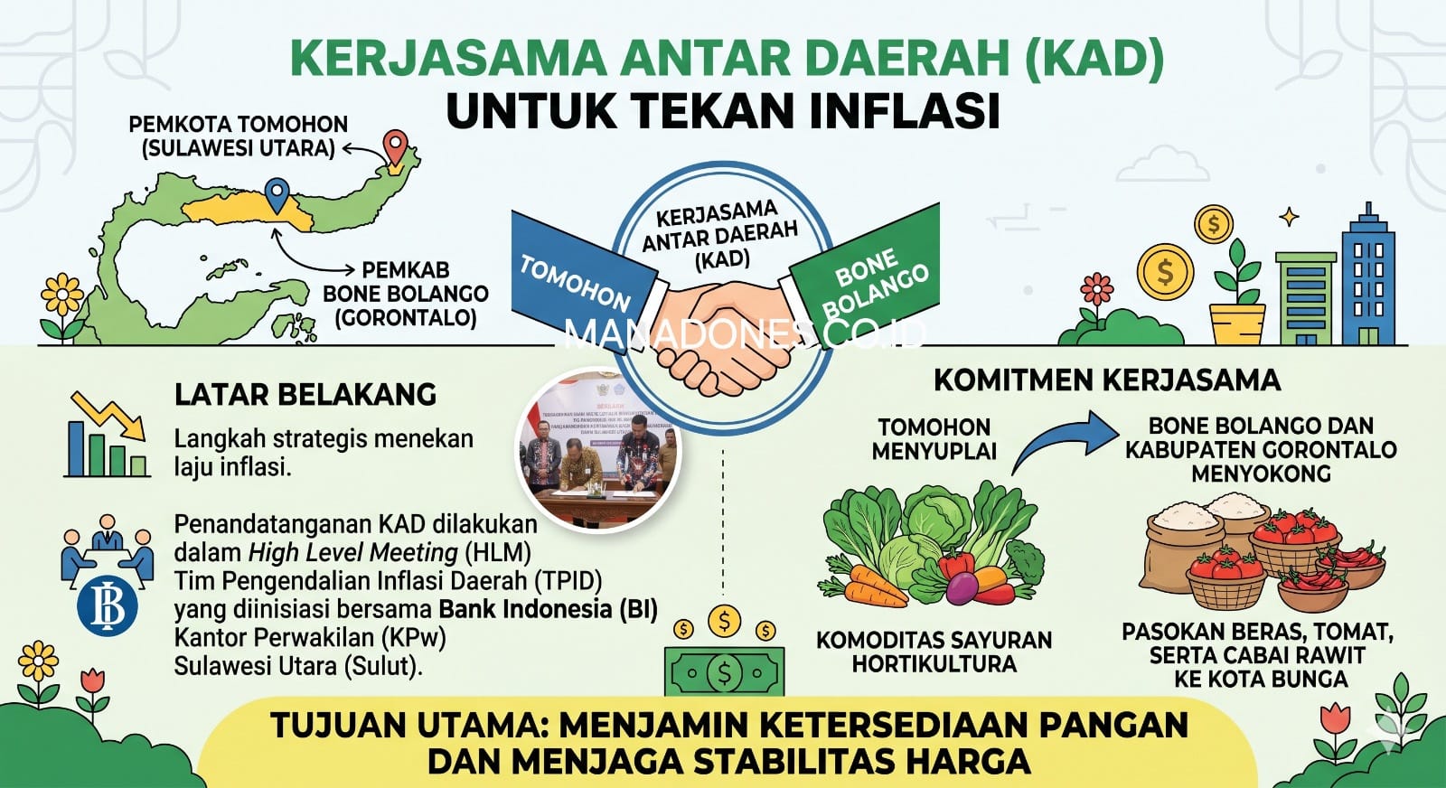 Kedua pemerintah ini, sepakat secara resmi menjalin Kerjasama Antar (KAD) untuk menekan laju inflasi. Penandatanganan KAD ini dilakukan pada dalam High Level Meeting (HLM) Tim Pengendalian Inflasi Daerah (TPID) yang diinisiasi bersama Bank Indonesia (BI) Kantor Perwakilan (KPw) Sulawesi utara (Sulut), kemarin di Kota Tomohon.