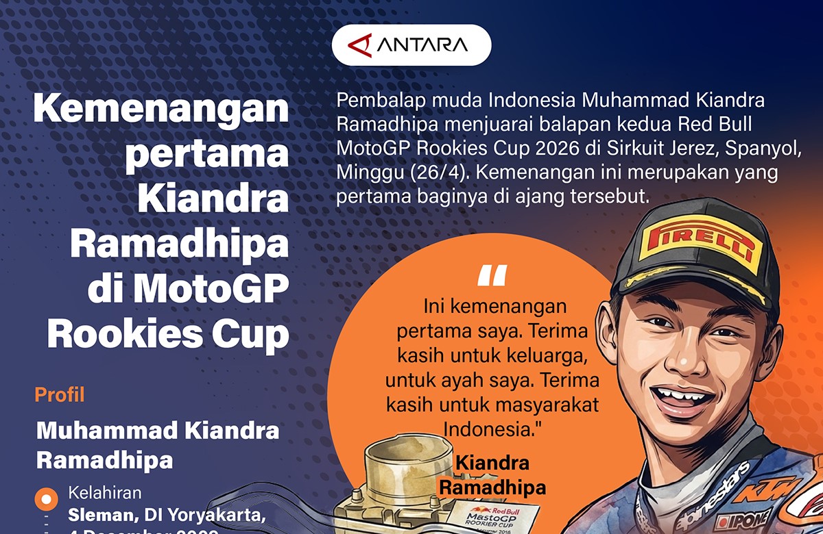 JAKARTA,27 APRIL 2026 (ANTARA) – Pembalap muda Indonesia Muhammad Kiandra Ramadhipa menjuarai balapan kedua Red Bull MotoGP Rookies Cup 2026 di Sirkuit Jerez,Spanyol Minggu (26/4). Kemenangan ini merupakan yang pertama baginya di ajang tersebut.